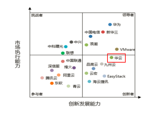 | 2016-2017年私有云市场各品牌竞争力分析象限,华云在创新者行列中名列前茅 |